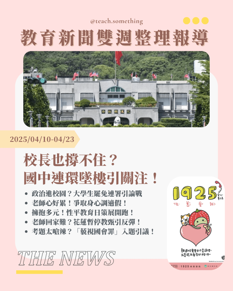 從校園中的政治爭議、教師的身心壓力,到性別平等的推廣、少子女化的衝擊,以及考題設計與學生安全等議題,都值得我們深入思考。