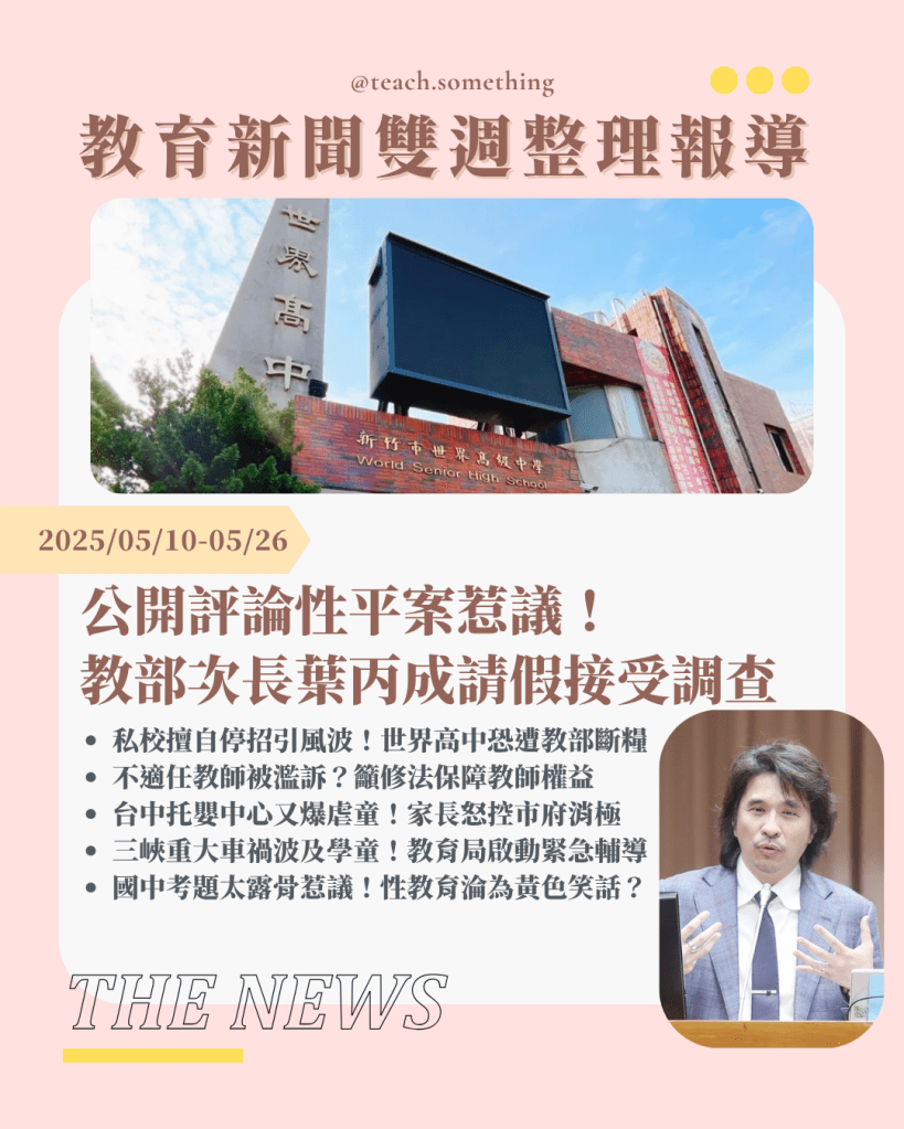 最後,三峽重大車禍波及學生,以及不適任教師濫訴問題,則直接反映了學生安全與教師權益在校園管理中的挑戰。
