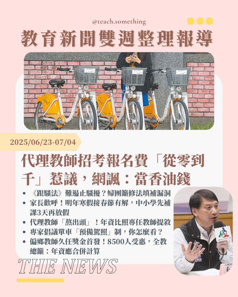 從《跟騷法》的修法困境,看到法規如何影響個體保護;到中小學寒假與春節的「無縫接軌」,感受到教育行政如何回應民意。接著,代理教師報名費的亂象,和久任獎金年資計算的問題,都揭示了教育體系內部待遇與制度的待優化之處。
