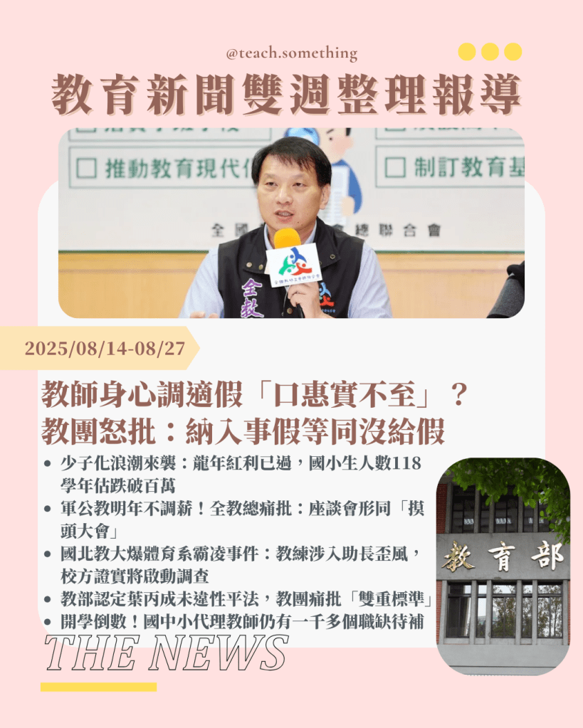 #教育 #教育時事 #教育現場 #教育議題 #教育新創 #議題評論 #教育生活 #生活雜談 #生活時事 #生涯發展 #心理輔導 #人際關係 #輔導 #教師請假 #身心調適假 #教師權益 #少子化 #學生人數 #軍公教調薪 #退撫基金 #薪資凍漲 #體育系 #校園霸凌 #性平調查 #葉丙成 #代理教師 #教師缺額